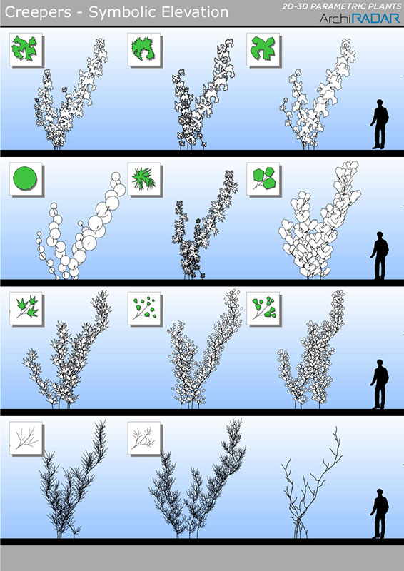 The objects are made with a low polygon quantity, they have a real growing factor according to the size and a corresponding symbolic view in elevation.