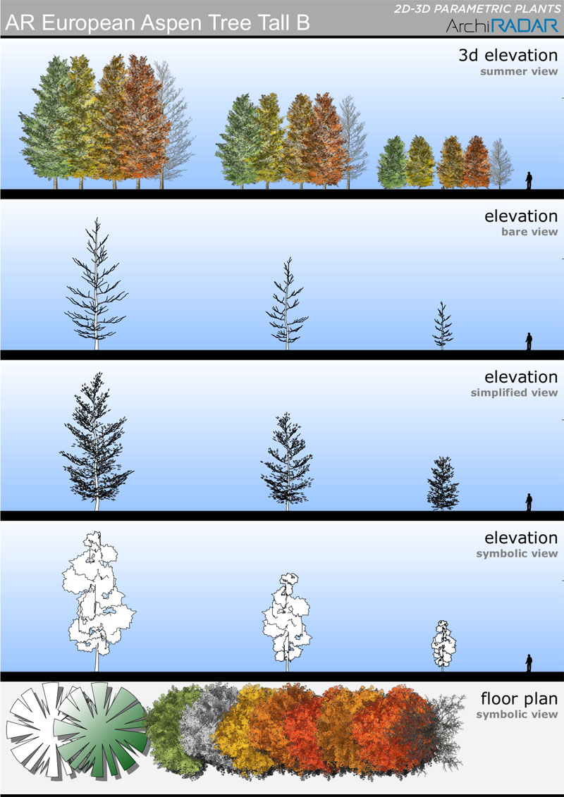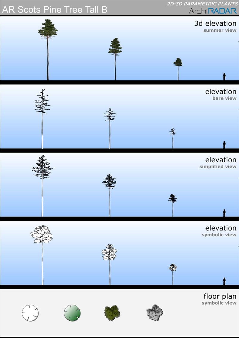 The objects are made with a low polygon quantity, they have a real growing factor according to the size and a corresponding symbolic view in elevation. Optimized for BIMX.
